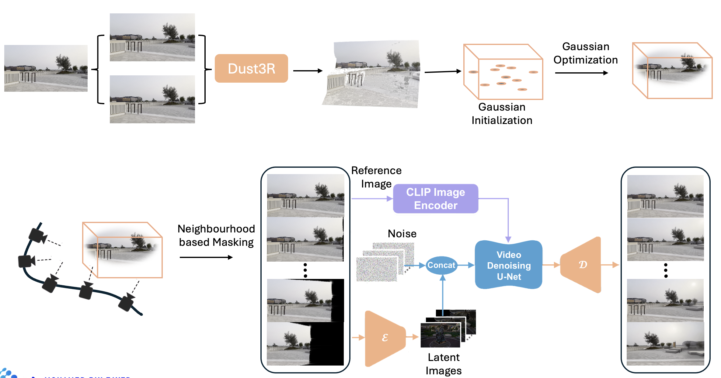 Description: This project tackles single-image novel view synthesis by integrating video diffusion models with Gaussian splatting. The framework leverages diffusion priors conditioned on 3D geometry to achieve photorealistic, geometrically consistent renderings with controllable camera poses, enabling smooth interpolation, realistic occlusion handling, and view-dependent effects for practical single-view 3D reconstruction.